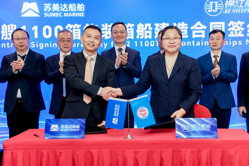 12月23日,苏美达船舶与上海锦江航运(集团)股份有限公司(简称 “锦江航运”)及其全资公司上海海华轮船有限公司(简称 “海华轮船”),在上海举行2艘1100箱集装箱船建造合同签约仪式。苏美达股份总经理助理、苏美达船舶党委书记、董事长何隽带队出席,锦江航运党委书记、董事长沈伟等领导莅临现场。这是双方首批合作后的再度携手。